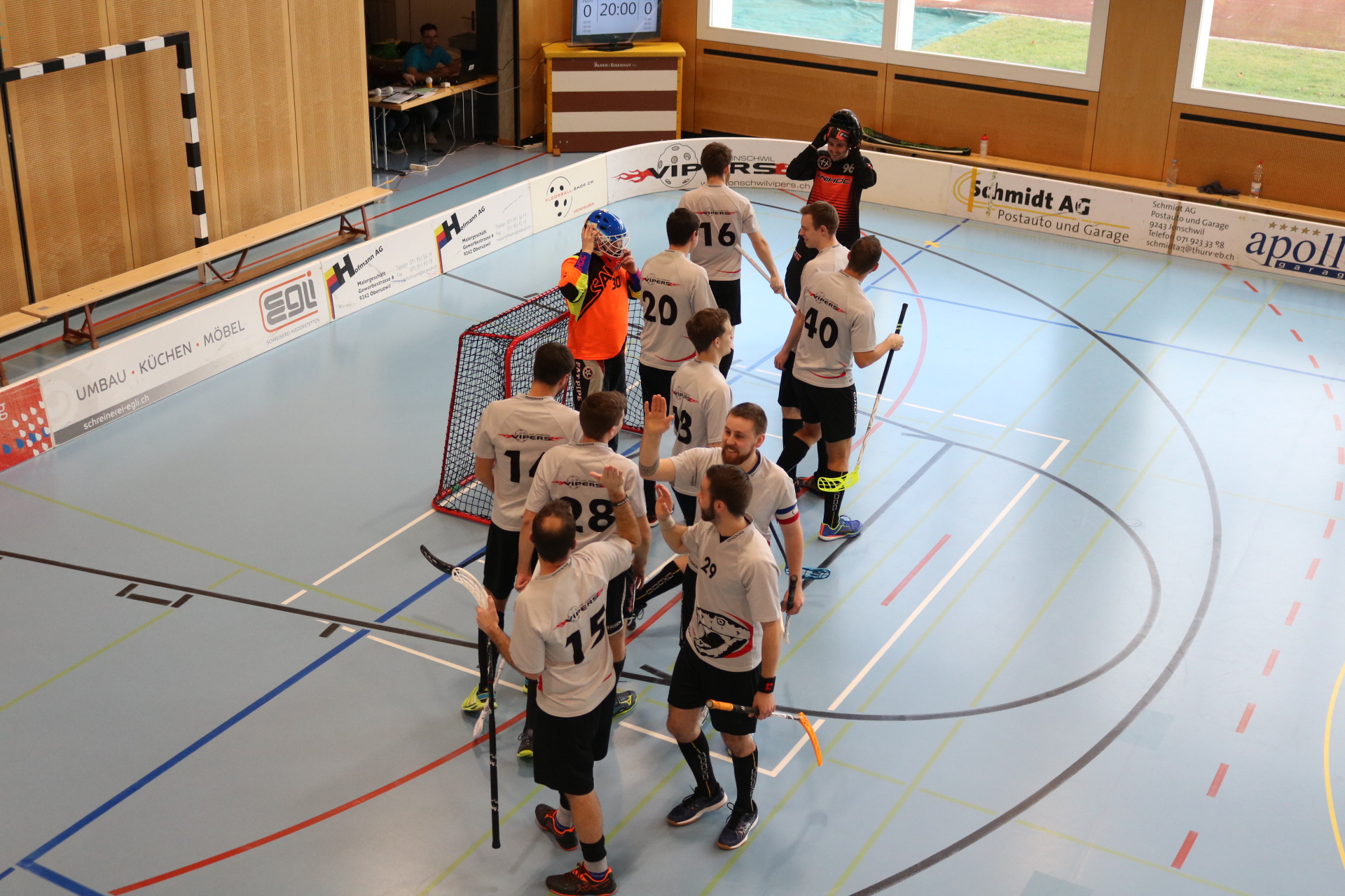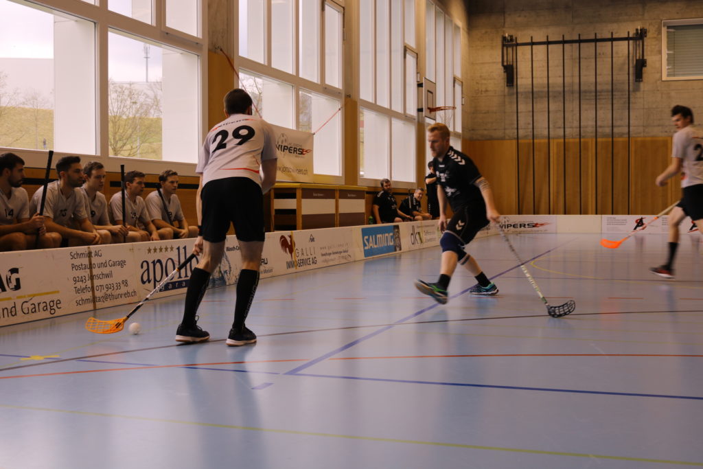 Mit leichten Personellen Veränderungen traten die Vipers dann zur zweiten Partie gegen die Löwen aus Bürglen an. Erneut krallte sich das Heimteam die Führung, dies um kurz darauf bereits wieder den Ausgleich zu kassieren. Von da an bestimmten die Jonschwiler dann aber das Spielgeschehen. Bis zur Ende der ersten Halbzeit erspielten sie sich eine 4:1 Führung. In der Vergangenheit vermochten die Vipers vielfach nach der Pause nicht sehr gut mit einer Führung umzugehen. Dies schien an diesem Tag ganz anders. Angefangen beim starken Torhüter M. Brändle der sich mehrfach auszeichnen konnte, gelang es die Führung 10 Minuten vor Schluss bis auf 7:2 auszubauen. Doch dann kamen die Jonschwiler doch noch ins Schwanken. Das ganze begann mit einem schönen Airhook Treffer, der aber unmöglich kein hoher Stock sein konnte. Die Löwen schöpften durch dieses Tor nochmals Hoffnung und tatsächlich erzielten sie noch drei weitere Treffer zum 6:7. Obwohl noch beinahe eine Minute zu spielen war, vermochten die Vipers diese Zeit dann doch noch sicher runter zu spielen.