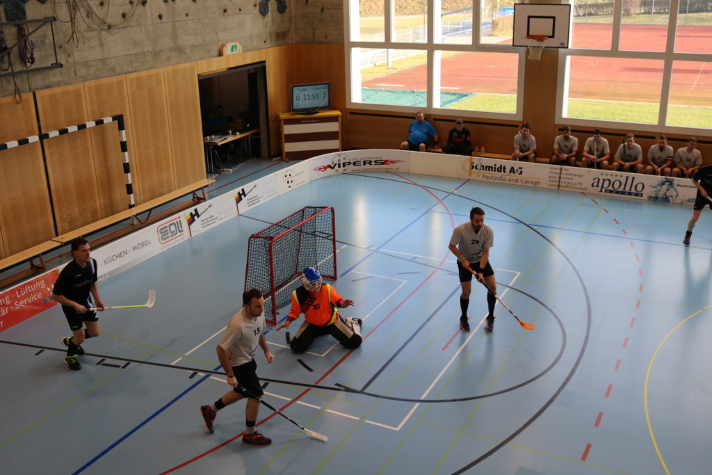 Im Gegensatz zu den letzten Spielen konnte das „zwei“ an dieser Runde mal wieder aus dem vollen Schöpfen und mit drei kompletten Linien antreten. Der Start in die erste Partie gegen Teufen war sehr verheissungsvoll. Defensiv standen die Jonschwiler sehr gut, offensiv gelangen sogar zwei Treffer zur Führung. Diese hielt relativ lange Bestand, doch dann zog das Heimteam eine schwache Phase ein, in der es den Vorsprung verspielte und nun selbst mit zwei Längen in Rückstand lag. Mit diesem 2:4 ging es in die Pause. Auch nach dem Seitenwechsel vermochten die Vipers nicht an die Leistung der Startphase anknüpfen. Einzig ihrem jungen Torhüter B.Müller war es zu verdanken, dass sie weiterhin einigermassen im Spiel blieben. Mit unglaublichen Paraden (von denen können sogar die Herren 1 Torhüter nur Träumen) brachte er die Zuschauer zum Staunen und den Gegner zum Verzweifeln. Dennoch musste er zwei weitere Male hinter sich greifen, bevor seine Vorderleute ebenfalls einen Doppelschlag erzielen konnten. Das Heimteam war nun wieder im Kampfmodus und versuchte mit allen Mitteln wenigstens noch den Ausgleich zu erzielen. Dieser Versuch war aber nicht von Erfolg gekrönt und so hiess der verdiente Sieger nach 40 gespielten Minuten Teufen-Bühler.