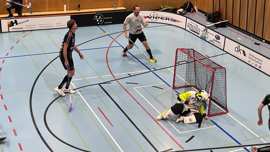 Mit neuer Motivation gingen die Vipers in das zweite Spiel. Sie wollten den Fans etwas bieten und nicht punktelos die Meisterschaftsrunde beenden. Der Start gelang. Die Vipers konnten mit einem Tor von M. Gübeli das 1:0 erzielen. Die Gegner konnten jedoch darauf reagieren und ausgleichen. Die Vipers wollten das Spiel auf ihre Seite ziehen und hatten viele Abschlüsse. Dadurch fielen auch 2 Tore von D. Haag und J. Brändle. Die Gegner liessen aber noch nicht locker. Sie probierten es weiter und konnten sogar zum 3:3 ausgleichen. Die Fans und die Bank von Jonschwil machten gute Stimmung. Das motivierte die 3 Spieler auf dem Feld so sehr, dass M. Gübeli auf Assist von D. Haag ein schönes Freistosstor erzielen konnte. Der Trainer von Pfannenstiel konnte damit nicht umgehen und übertrieb es so weit, dass der Schiri ihm eine 2 Minuten Strafe erteilte. Das kam den Vipers zu Gute. Sie konnten die Überzahl nutzen und J. Brändle erzielte einen schönen Weitschusstreffer ins Eck. 5:3! Die Gegner mussten reagieren. Der Goalie ging auf die Bank und sie spielten mit 4 vs 3. Die Vipers konnten es aber gut verteidigen. Trotzdem erzielten die Gegner das 5:4 mit noch wenigen Sekunden zu spielen. Man musste doch noch zittern. Wir schickten den bullystarken J. Brändle aufs Feld. Aber natürlich verlor er das wichtige Bully. Der gegnerische Goalie rannte auf die Bank und es war wieder ein 4 vs 3. Der erwähnte J. Brändle konnte jedoch den Ball erobern und ihn im leeren Goal versenken. Das Spiel endete so mit einem 6:4 für die Vipers.