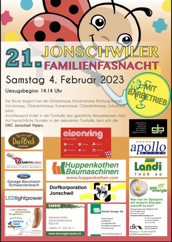 Am kommenden Samstag, 04.02.2023 findet in Jonschwil der Fasnachtsumzug durchs Dorf & die anschliessende Fasnachtsparty in der Turnhalle Jonschwil statt. Wir freuen uns auf euch & verwöhnen euch gerne mit Speis & Trank!