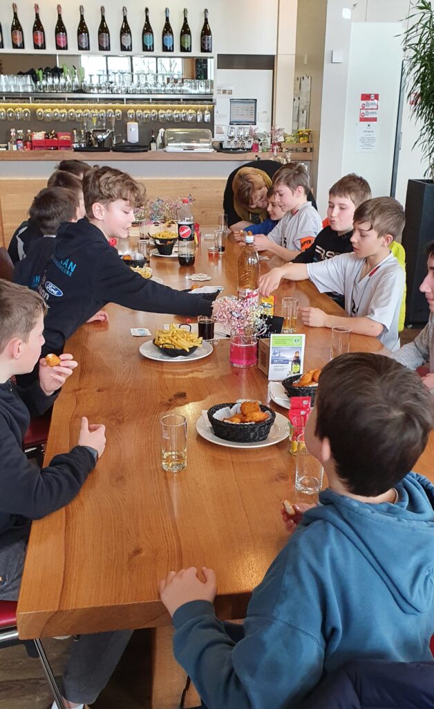 Da so ein Sieg gefeiert werden muss, trafen sie sich die treuen Fans sowie die Mannschaft im Anschluss im Restaurant Freihof zu Chicken-Nuggets und Pommes. Verdient ist verdient!