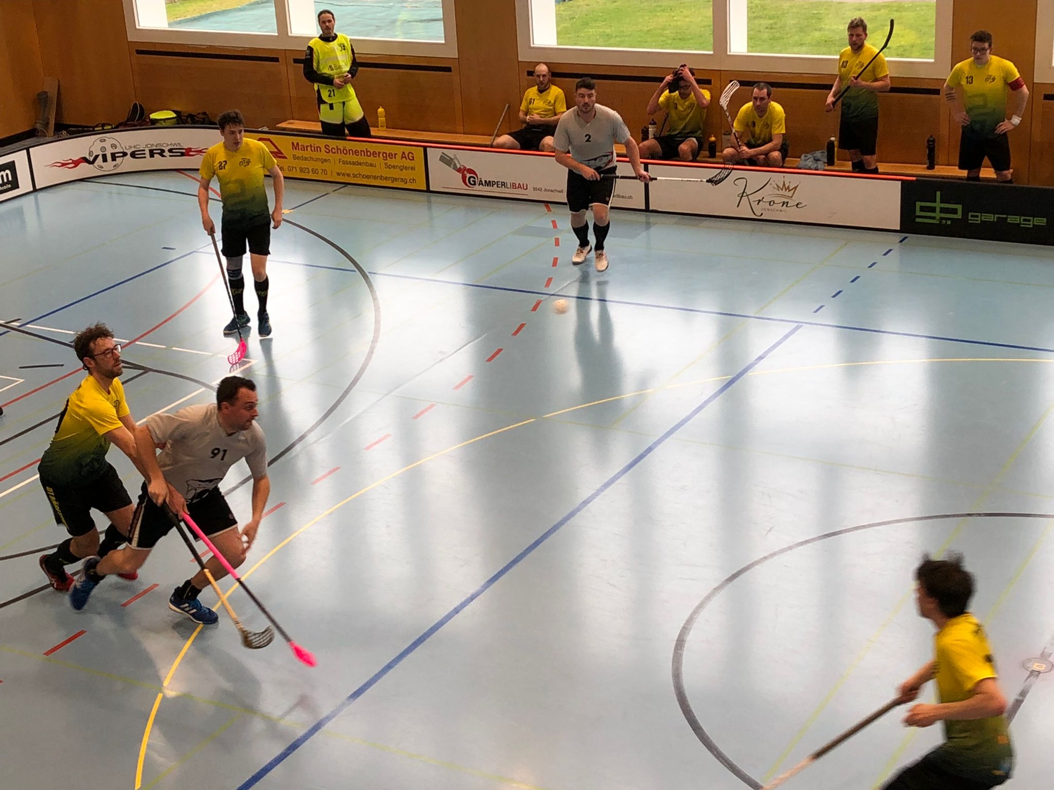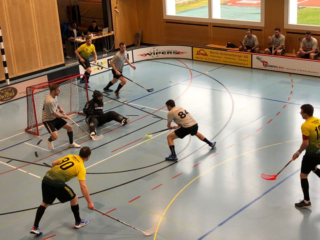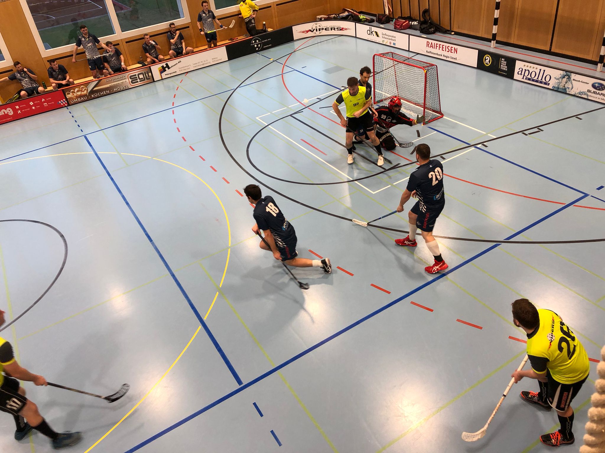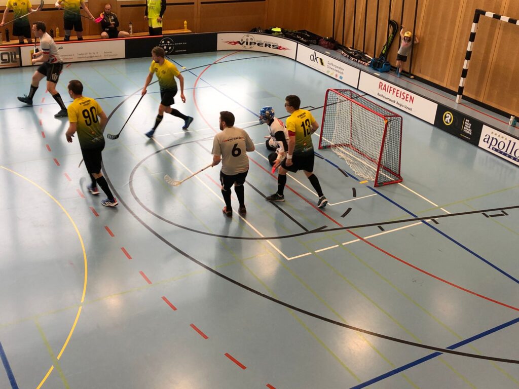 Was liegt da wirklich drin? Kommen die nun wie die Feuerwehr? Wie halten wir dem Druck stand? Fragen über Fragen zur Pause, Antworten konnten die Vipers nur selber geben. Weiter konzentriert spielen und vorne die Chancen nutzen, welche sich ergeben. «Denn chunt das guet», um es mit den Worten von Captain Gämperli zu sagen. Was aber zuerst kam, war der Ausgleich des Gegners. Schon kurz nach Wiederanpfiff waren die Tabellenführer erfolgreich. Das Spiel somit wieder offen und es war noch eine ganze Halbzeit zu spielen. Beide Teams drückten auf den Führungstreffer, konnten aber in den nächsten Minuten nicht reüssieren. Als dann der Ball das nächste Mal im Tor einschlug, war es wiederum Malgaroli der den Ball aus dem Netz holen musste. Die Vipers waren also wieder in Rücklage, ein Gefühl das man diesen Sonntag gut kennengelernt hatte. Meistens wusste man aber auch eine Antwort darauf und kämpfte sich zurück ins Spiel. Etwas zu viel vom Kampf bekam dann S. Patelli ab, der nach einem Zusammenprall eine Platzwunde oberhalb des Auges hatte. Der harte Indianer holte sich draussen aber nur kurz ein Pflaster ab, spielte dann gleich weiter. Ein Beispiel dafür, dass auch dieses Mal den Vipers der Kampfgeist nicht abzusprechen war und im Gegensatz zum ersten Spiel, zeigte das Team eine sehr gute Leistung. Einfach das Tore machen, fiel den Vipers schwer. Darum waren es dann wieder die Tabellenersten, welche treffen konnten. Somit waren wir bei Hälfte der zweiten Halbzeit bei einem 2-Tore-Rückstand der Vipers. Nichts was noch auszubügeln wäre. Eigentlich. Doch irgendwie war der Wurm drin. Entweder parierte der starke Torhüter, der Stock der Vipers war ein bisschen zu kurz um den Pass noch über die Linie zu drücken oder man scheitere am Pfosten, wie es Scharfschütze Hasler erfahren musste. So wurde am Ende auch noch probiert mit dem Mann mehr etwas zu reissen, jedoch fiel auch so auf beiden Seiten kein Treffer mehr. Die Vipers mussten an der Heimrunde auch im zweiten Spiel als Verlierer vom Platz gehen. Immerhin konnte man sich hinterher nicht wirklich Vorwürfe machen und bekam auch vom Gegner Lob.