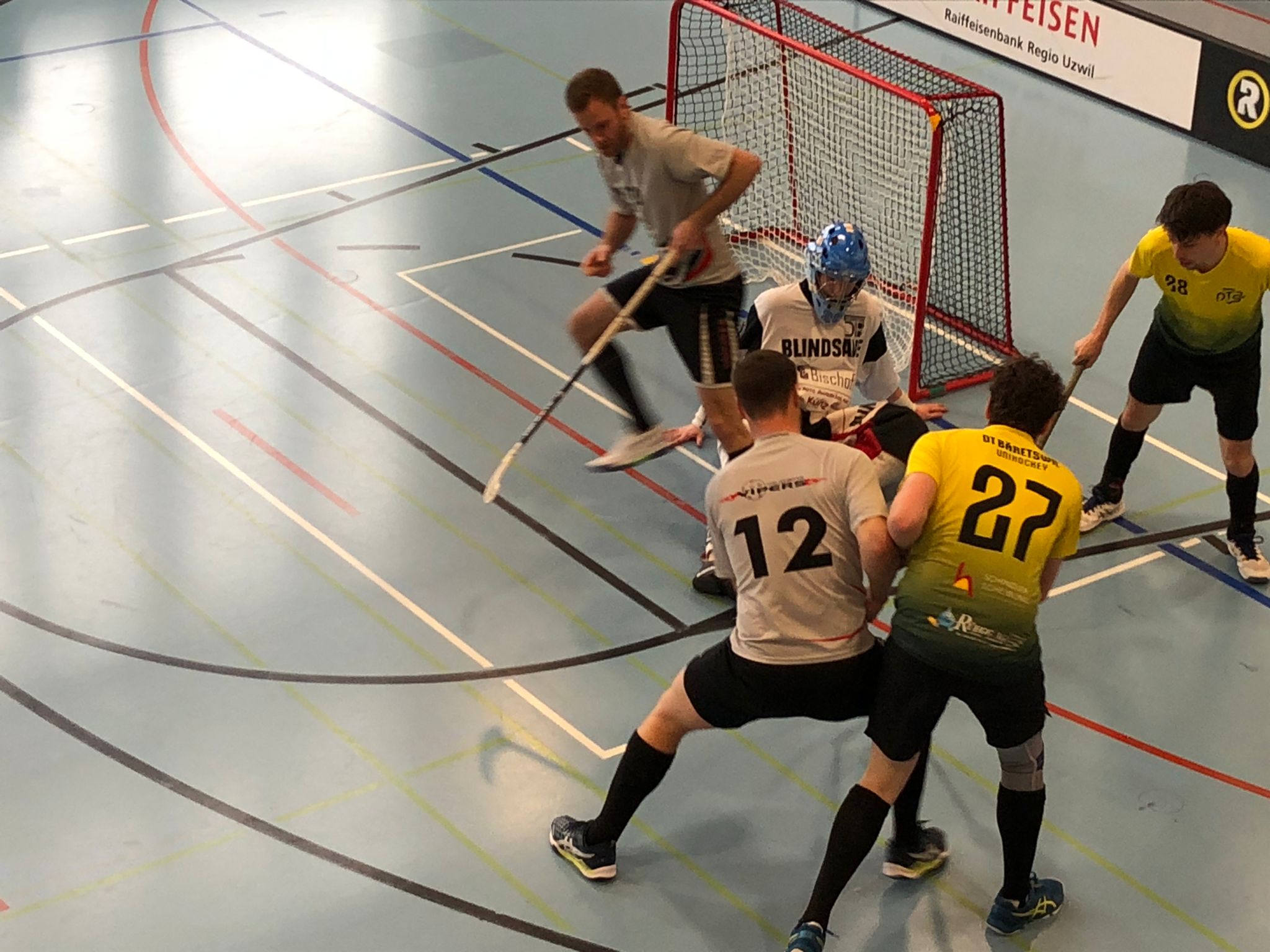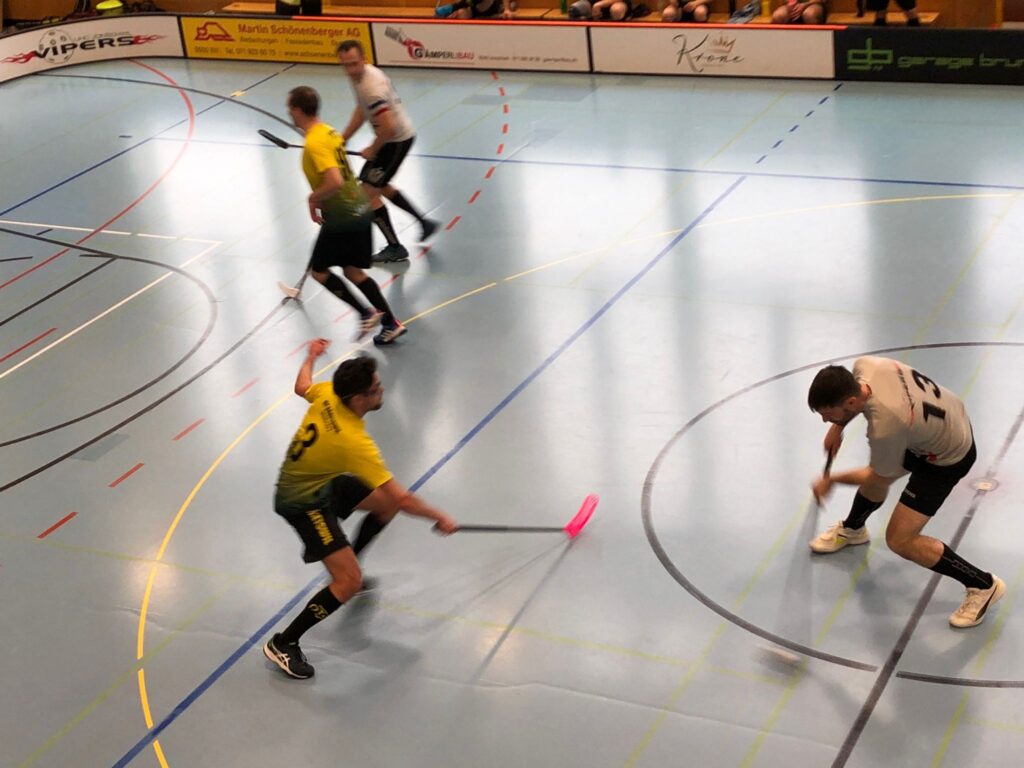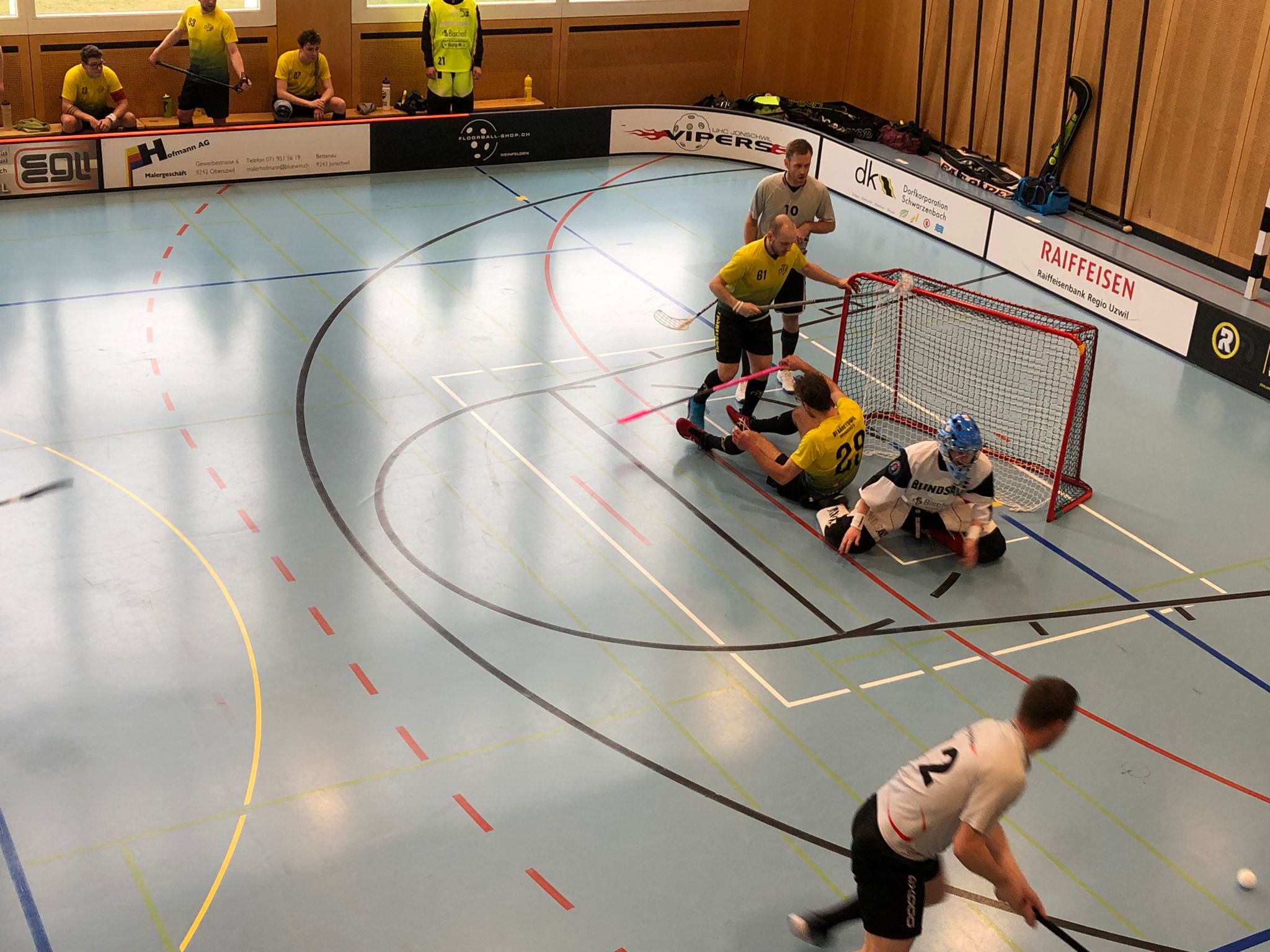 Was liegt da wirklich drin? Kommen die nun wie die Feuerwehr? Wie halten wir dem Druck stand? Fragen über Fragen zur Pause, Antworten konnten die Vipers nur selber geben. Weiter konzentriert spielen und vorne die Chancen nutzen, welche sich ergeben. «Denn chunt das guet», um es mit den Worten von Captain Gämperli zu sagen. Was aber zuerst kam, war der Ausgleich des Gegners. Schon kurz nach Wiederanpfiff waren die Tabellenführer erfolgreich. Das Spiel somit wieder offen und es war noch eine ganze Halbzeit zu spielen. Beide Teams drückten auf den Führungstreffer, konnten aber in den nächsten Minuten nicht reüssieren. Als dann der Ball das nächste Mal im Tor einschlug, war es wiederum Malgaroli der den Ball aus dem Netz holen musste. Die Vipers waren also wieder in Rücklage, ein Gefühl das man diesen Sonntag gut kennengelernt hatte. Meistens wusste man aber auch eine Antwort darauf und kämpfte sich zurück ins Spiel. Etwas zu viel vom Kampf bekam dann S. Patelli ab, der nach einem Zusammenprall eine Platzwunde oberhalb des Auges hatte. Der harte Indianer holte sich draussen aber nur kurz ein Pflaster ab, spielte dann gleich weiter. Ein Beispiel dafür, dass auch dieses Mal den Vipers der Kampfgeist nicht abzusprechen war und im Gegensatz zum ersten Spiel, zeigte das Team eine sehr gute Leistung. Einfach das Tore machen, fiel den Vipers schwer. Darum waren es dann wieder die Tabellenersten, welche treffen konnten. Somit waren wir bei Hälfte der zweiten Halbzeit bei einem 2-Tore-Rückstand der Vipers. Nichts was noch auszubügeln wäre. Eigentlich. Doch irgendwie war der Wurm drin. Entweder parierte der starke Torhüter, der Stock der Vipers war ein bisschen zu kurz um den Pass noch über die Linie zu drücken oder man scheitere am Pfosten, wie es Scharfschütze Hasler erfahren musste. So wurde am Ende auch noch probiert mit dem Mann mehr etwas zu reissen, jedoch fiel auch so auf beiden Seiten kein Treffer mehr. Die Vipers mussten an der Heimrunde auch im zweiten Spiel als Verlierer vom Platz gehen. Immerhin konnte man sich hinterher nicht wirklich Vorwürfe machen und bekam auch vom Gegner Lob.