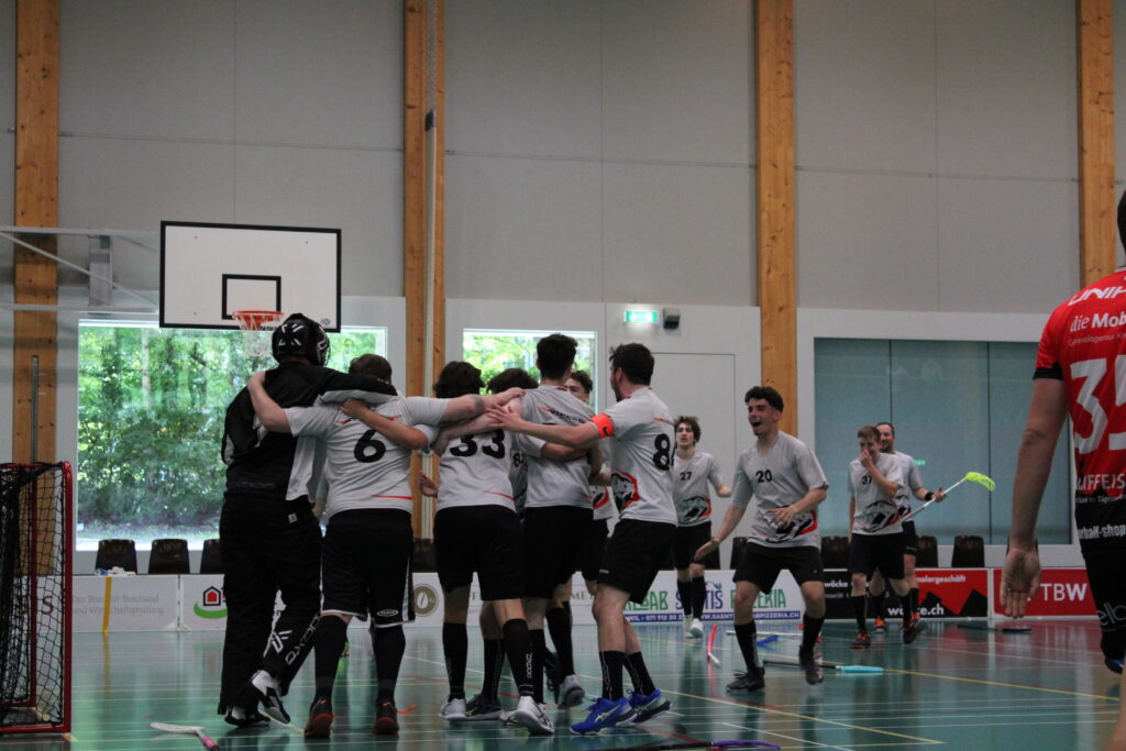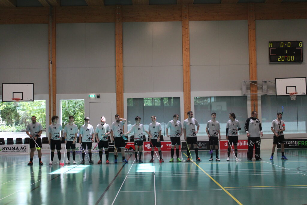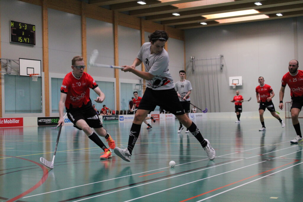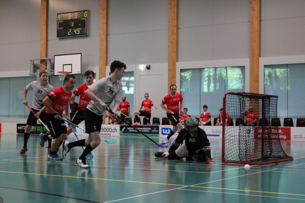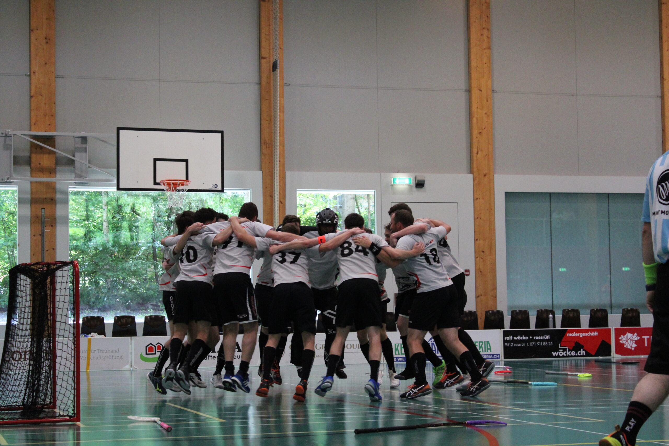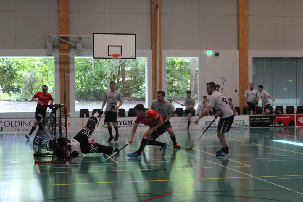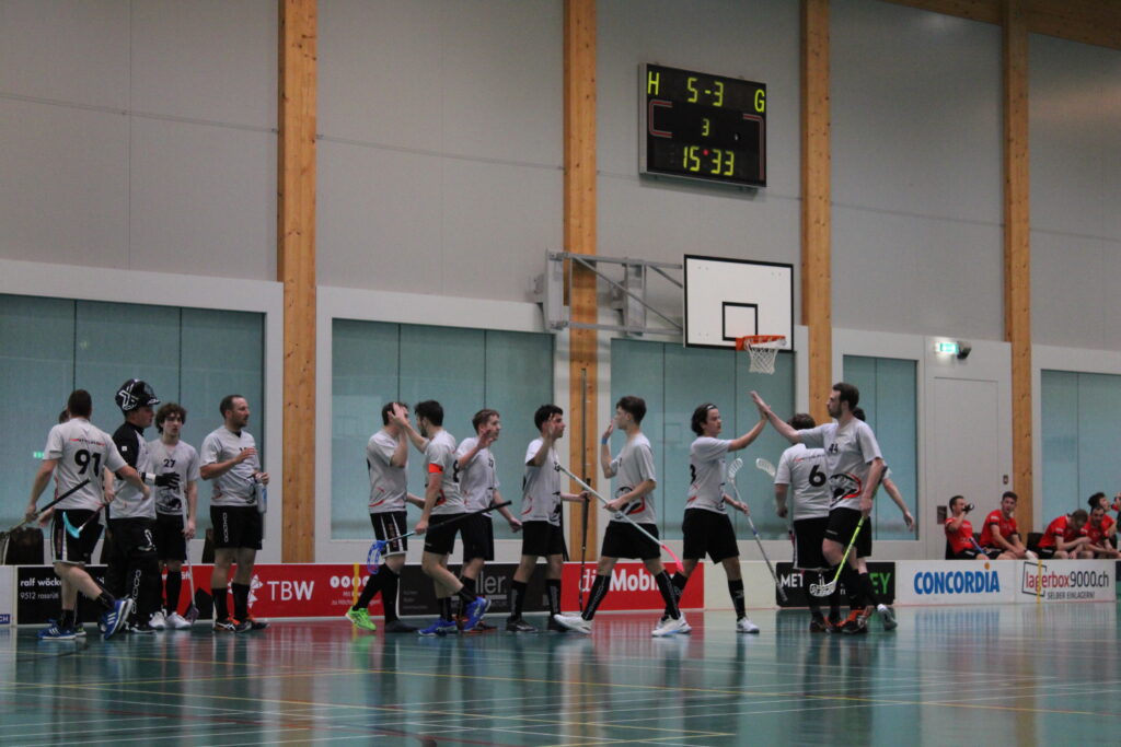 In der 50. Minute war es dann soweit, die Zeit war reif um die Führung in diesem Spiel zu übernehmen. Nach einem sauber herausgespielten Konter, wobei sich S. Hollenstein und Torschütze S. Patelli Skorerpunkte gutschreiben liessen, haben wir dann wie gefordert auch lautstark gejubelt. Familie Patelli auf der Tribüne bejubelte das Tor ihres Sohnes ebenfalls lautstark, so dass dieser noch den Reservetank anzapfte und 5 Minuten später gleich nochmals skorte. Diesmal agierte er als Passgeber, worauf J. Brändle das Runde im Eckigen unterbrachte. 5:3 und nur noch etwas mehr als 4 Minuten zu spielen. Der Coach aus Tägerwilen fands nicht mehr lustig und gönnte seinen Spielern ein Time Out. Nach besagter Unterbrechung agierten die Thurgauer plötzlich mit 6 Spieler und ohne Torwart. War aber zu erwarten. So spielten wir möglichst auf Zeit um den Vorsprung über die Zeit zu retten. In der 58. Minute musste dann P. Sägesser noch ein letztes Mal hinter sich greifen. Tägerwilen konnte auf 4:5 verkürzen. Dann wars das aber. P. Sägesser wollte um keinen Preis in die Verlängerung und hielt alles was aufs Tor kam. Auf Grund herausragender Leistung wurde P. Sägesser noch zum Man oft the Match gewählt und erhielt einen Pack Kägi Fret. Gratulation dazu!